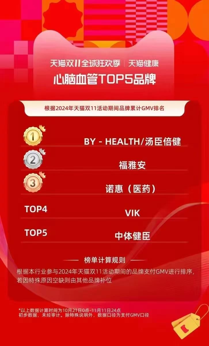 天猫双11全球狂欢季心脑血管品类TOP5品牌